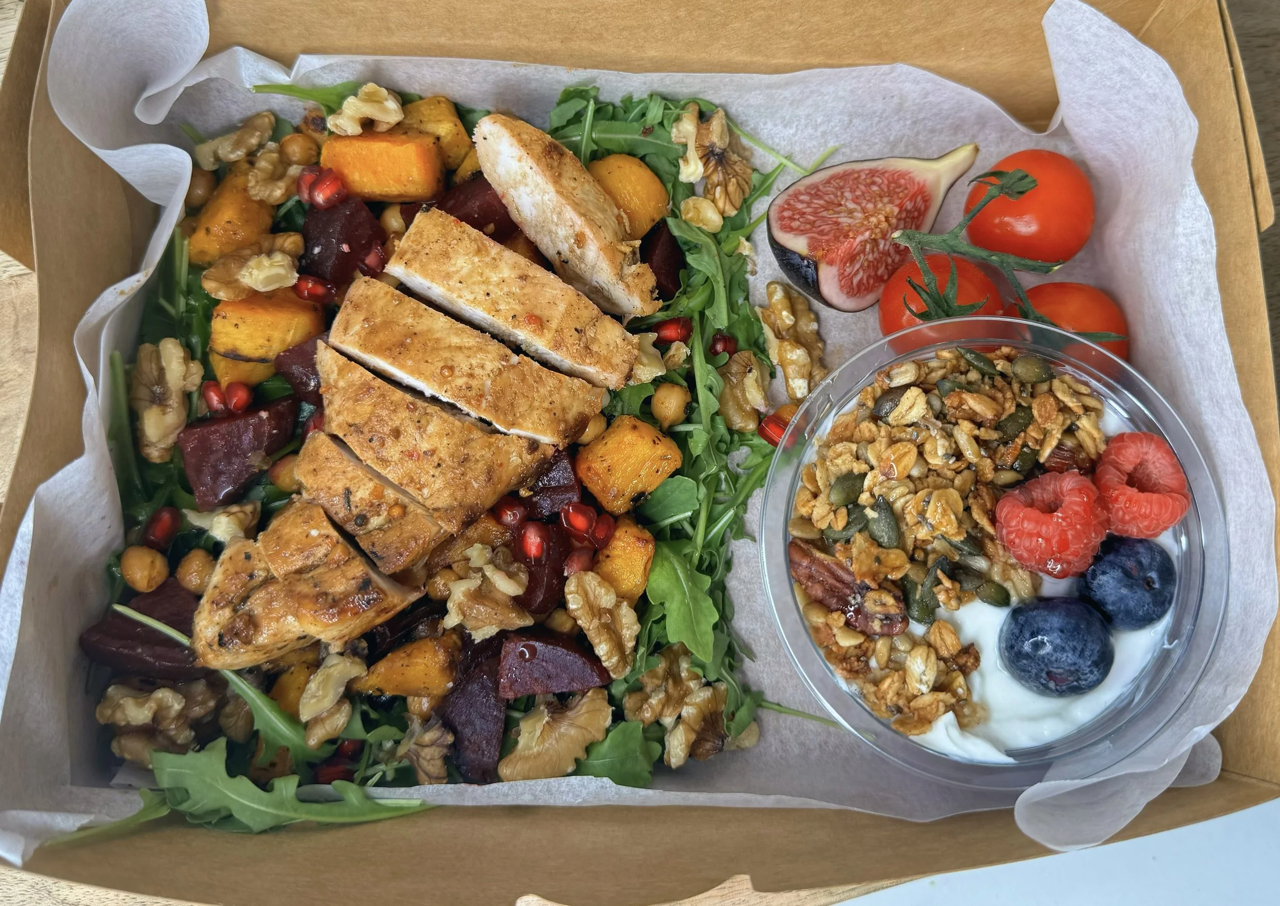 1x Yoghurt pot with homemade nutty granola, berry compote & fresh fruit